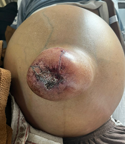 A 45-year-old male massive ascites, and a large umbilical hernia with ulceration